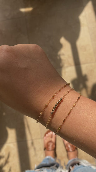 Sleek, minimal, and timeless ✨ The Bead Bar Bracelet features seven round, polished 14K gold-filled beads centered on a delicate flat cable chain. Lightweight and refined, it’s perfect for everyday wear or layering with other bracelets for a modern, effortless look. Tarnish resistant, hypoallergenic, and made to last — a must-have addition to your capsule jewelry collection.
