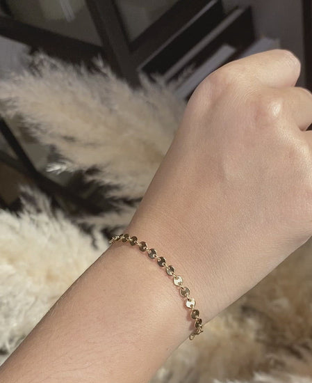 A timeless favorite with modern edge ✨ This Coin Disk Bracelet features a delicate eternity-style chain made of tiny flattened coins, creating a fluid, reflective shimmer with every movement. Available in three metals — gold, sterling silver, and rose gold — this bracelet layers beautifully or shines on its own. Lightweight, tarnish resistant, and effortlessly chic, it’s the perfect everyday essential or gift.