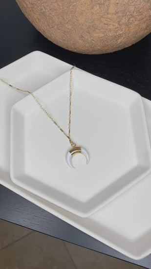 A lovely double horn pendant necklace with a striking band of gold in the center and upgraded fancy bar chain. This beauty will take your look to the next level. Go ahead, take your style by the horns and make a strong statement!
