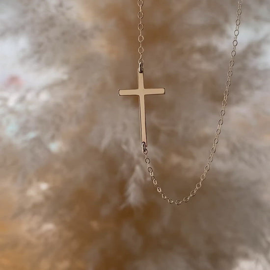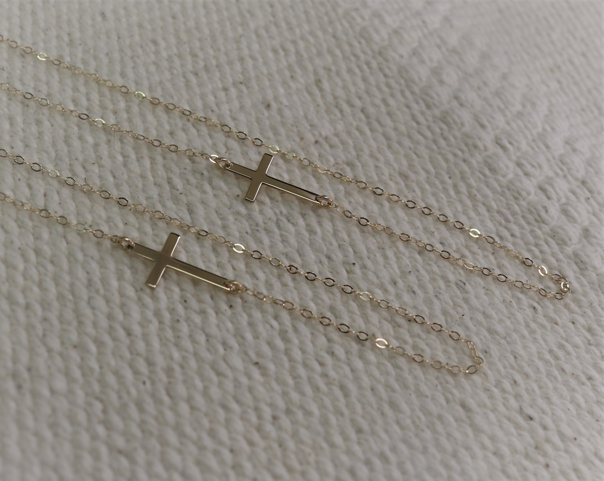 Our 14K Solid Gold Small Sideways Cross Necklace is a timeless, meaningful piece crafted with elegant simplicity. Designed with a delicate horizontal cross pendant suspended from both sides along a fine 14K flat cable chain, this necklace rests effortlessly at the collarbone for a sleek, modern look.