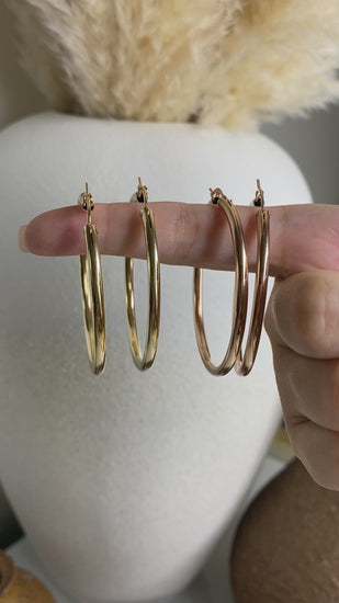 Step into bold style with these mega hoop earrings, oversized at 50mm in diameter and 3mm thick. Designed to make a statement, these hoops are handcrafted in 14K gold filled, 14K rose gold filled, or sterling silver.